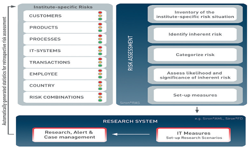 Siron ® RAS supporte les banques lors de la création et du développement continuel de l'analyse des risques. Pour ce but l'identification, la catégorisation et l'évaluation des risques de fraude constituent la base pour toutes les activités de suivi dans la banque afin d'initier et d'arranger des programmes étendus de la lutte contre le blanchiment de fraude, du financement du terrorisme et d'autres actions punissables. Par la focalisation sur les risques essentiels il est possible de réaliser des avantages de frais via l'utilisation de ressources plus effective et les processus de contrôle plus efficaces.